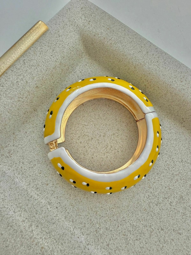 Apresentamos o Bracelete Esmaltado Maracujá, uma peça ousada que remete à frescura e à vitalidade da fruta tropical. Este bracelete sem fecho possui uma abertura e fechamento click, proporcionando praticidade e conforto para o seu dia a dia.