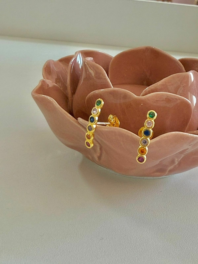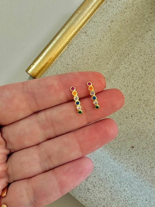 Peça folheada possui 6 pedras de zircônia colorida, perfeita para combinar com qualquer look. É atemporal e fácil de usar, garantindo um visual sempre elegante.