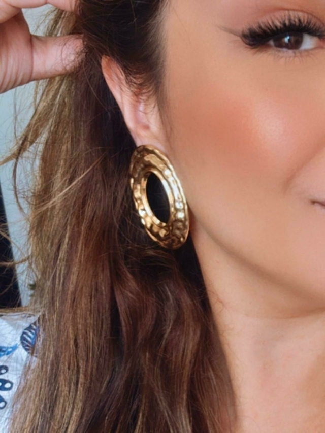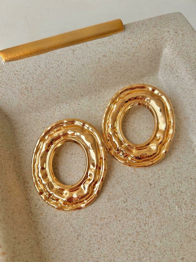 Produzido em metal folheado com banho de verniz, garantindo brilho e durabilidade. Peça com fechamento tradicional pino com tarraxa. Transforme seu look com o Brinco Oval Martelado.