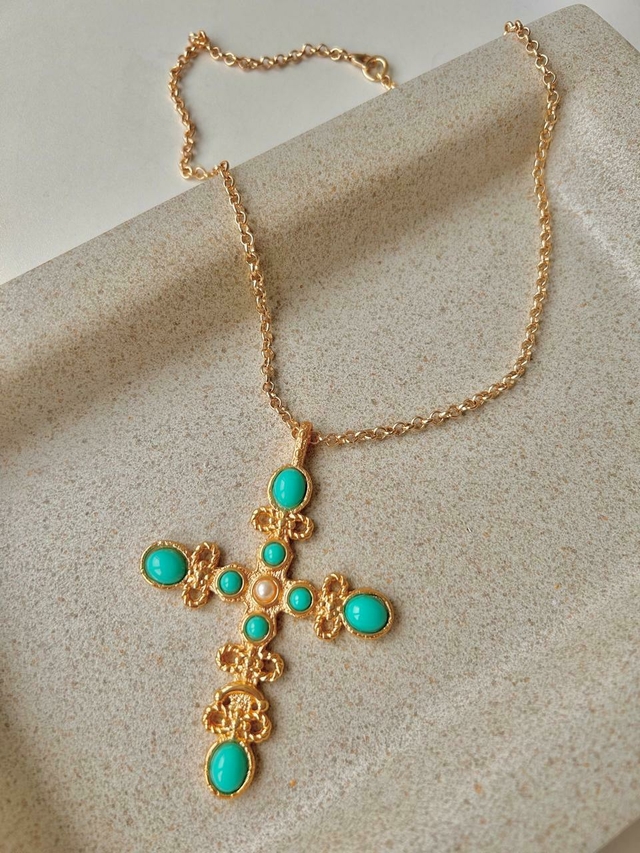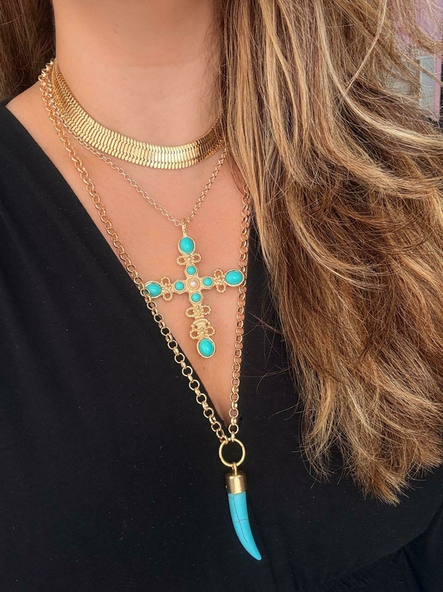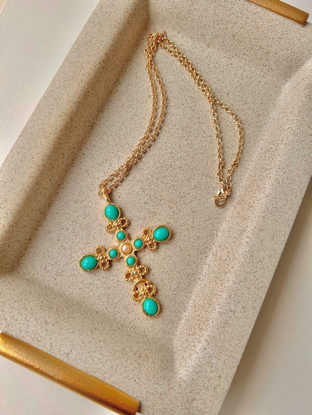 A Corrente Crucifixo Turquesa é a peça ideal para quem busca um estilo elegante e sofisticado! Com um design moderno, esta corrente é perfeita para compor um look cheio de personalidade. O crucifixo, é todo trabalhado com micro pérola e pedras em resina turquesa, garantindo um toque especial e vibrante.