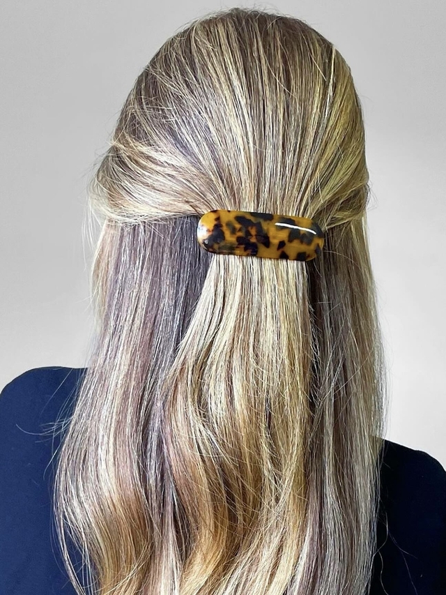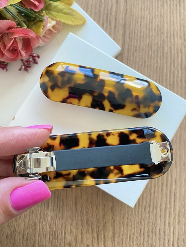 CARACTERÍSTICAS: Produzida em acetato de alta qualidade, essa presilha garante brilho e durabilidade. Todas as peças contam com proteção emborrachada, evitando danos aos fios, e um freio removível que permite prender até mesmo os cabelos mais volumosos.